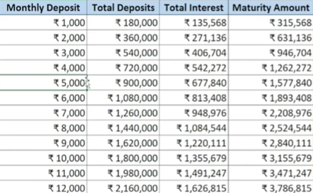 Below is the total interest and maturity amounts on PPF monthly deposits of Rs. 1000 to Rs. 12000: