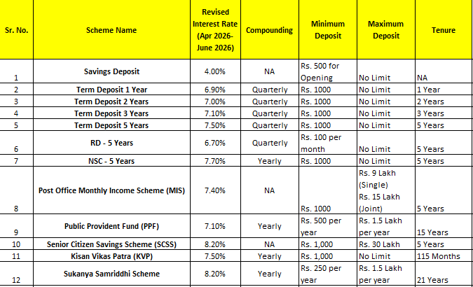 Latest Post Office Interest rates for quarter April to June 2026 are as follows: